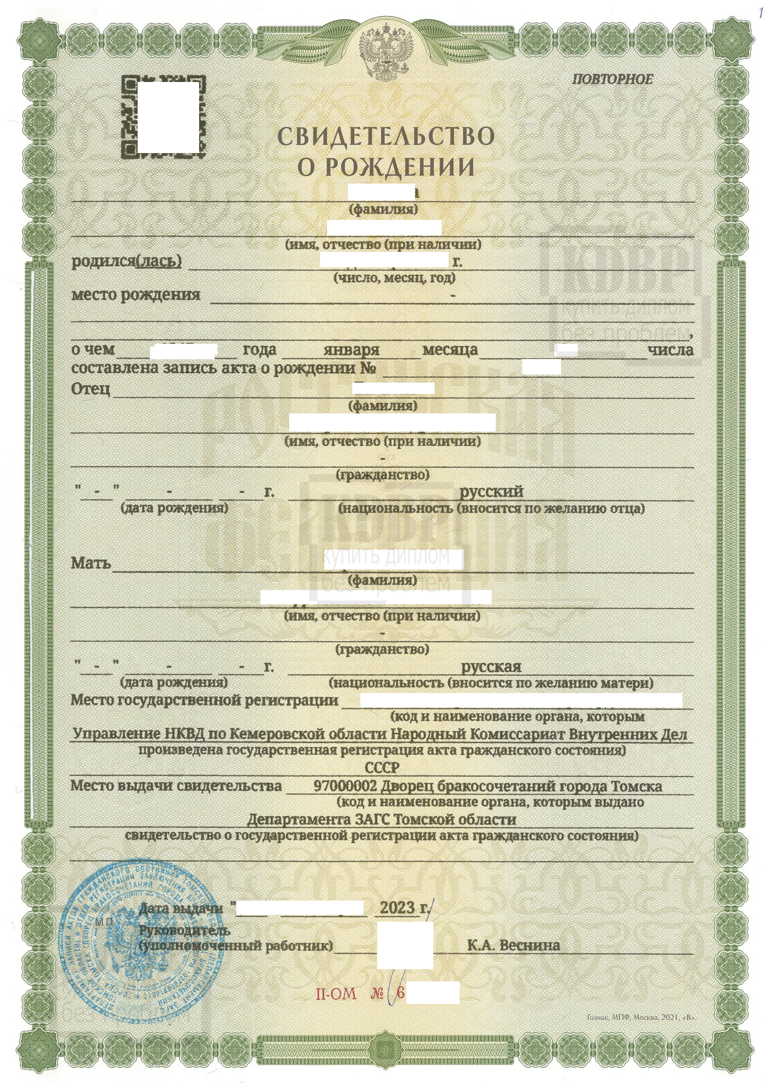 Мы можем сделать свидетельства о рождении любых годов выдачи. Это могут быть документы советского образца от разных республик или современные российские. Ну и самые новые — с QR-кодом.
